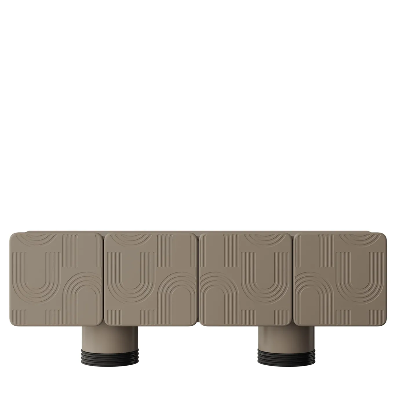 This elegant sideboard features four engraved doors with soft-closing hinges and two stylish round legs presented in matte greige lacquered finish with extra matt black lacquer finish feet. Its design includes beautifully rounded fronts and angles, adding a touch of sophistication also enriched by the internal drawer and shelves.