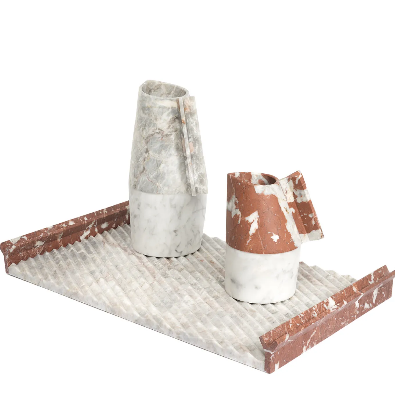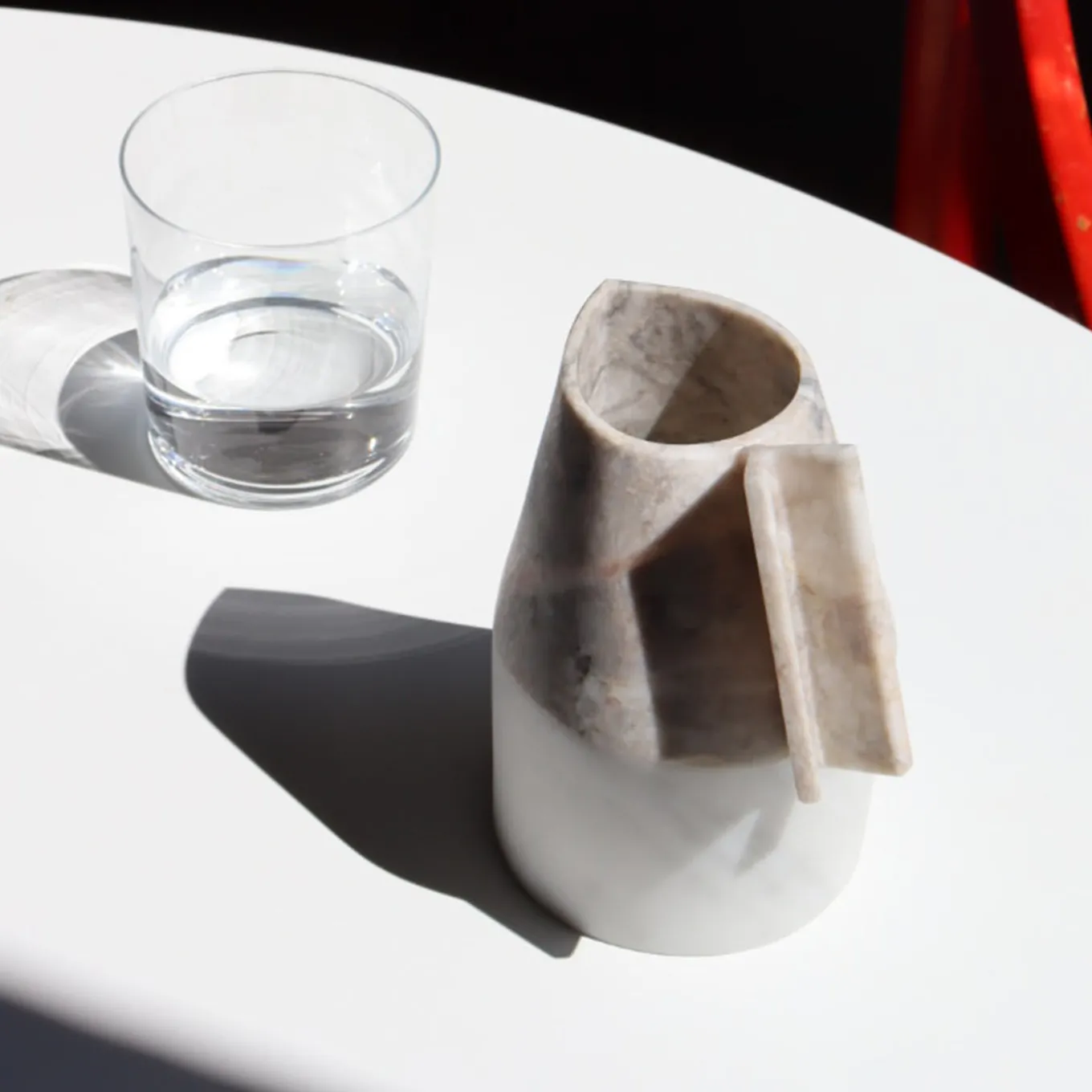 A study in form and material, this refined carafe will add a timeless and modern touch to a dining table or kitchen countertop. Designed by Patricia Urquiola for Editions Milano, the carafe is hand fashioned of two types of marble, the top made of light-grey with delicate red veining and the bottom in white. The irregular shape of the carafe is highlighted by the teardrop-shaped mouth, the upward-tilted spout, and the flat-edged handle, creating a visually intriguing yet harmonious piece.