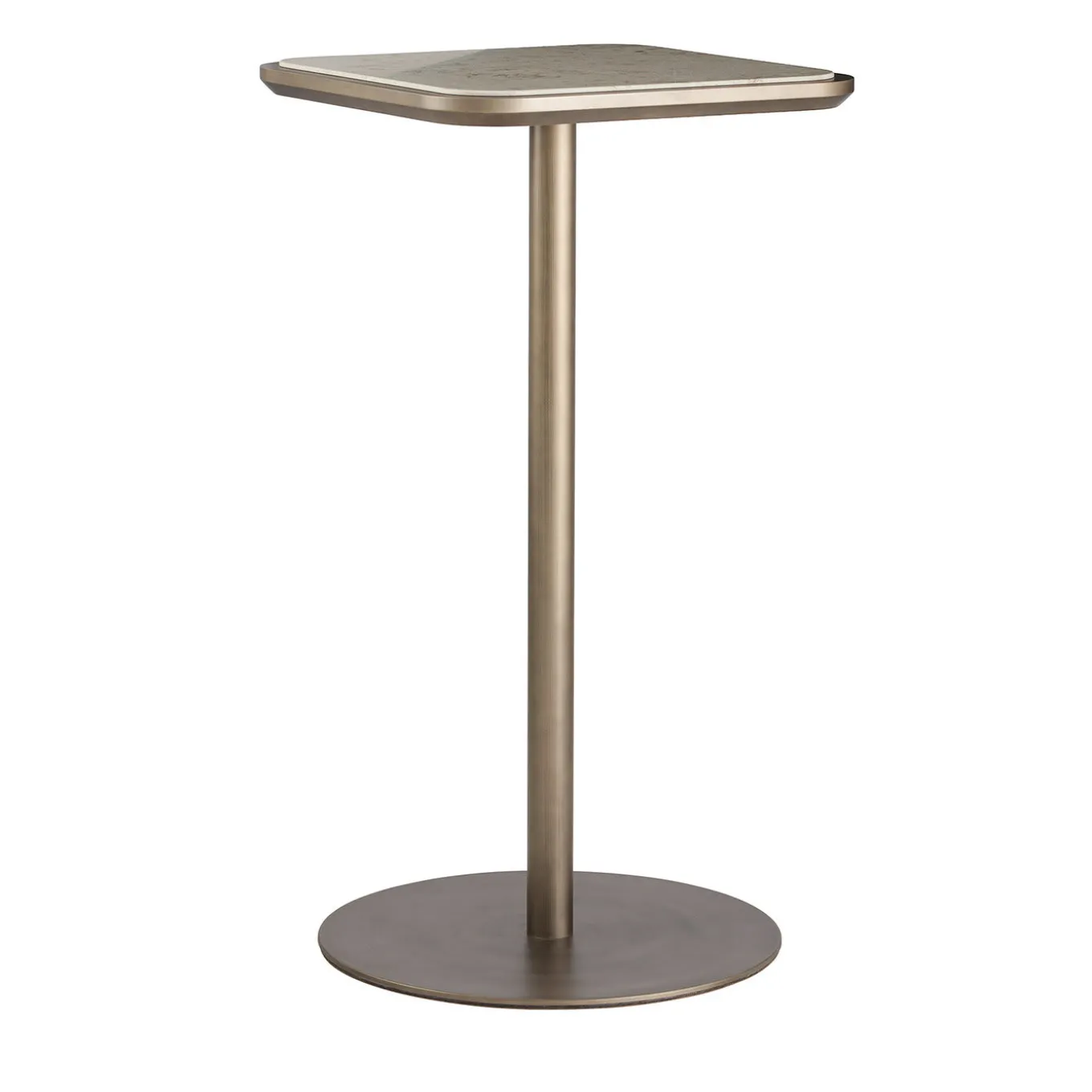 Propped into a lounge area, loft corner, or kitchen, this bar table of the Uno Essential series adds a luxurious touch of uncompromising quality. Featuring a prized Sahara Gold marble round top (mounted on a solid wood supporting panel), the slender and tall iron pedestal base and round foot have a brushed brass finish for a glamorous combination of elegance and industrial design. The simple, compact volumes make it a timeless piece complementing any decor. Nylon glides allow easy movement while protecting hard wood, tile floors, and carpeting. Contract and commercial certifications available upon request.