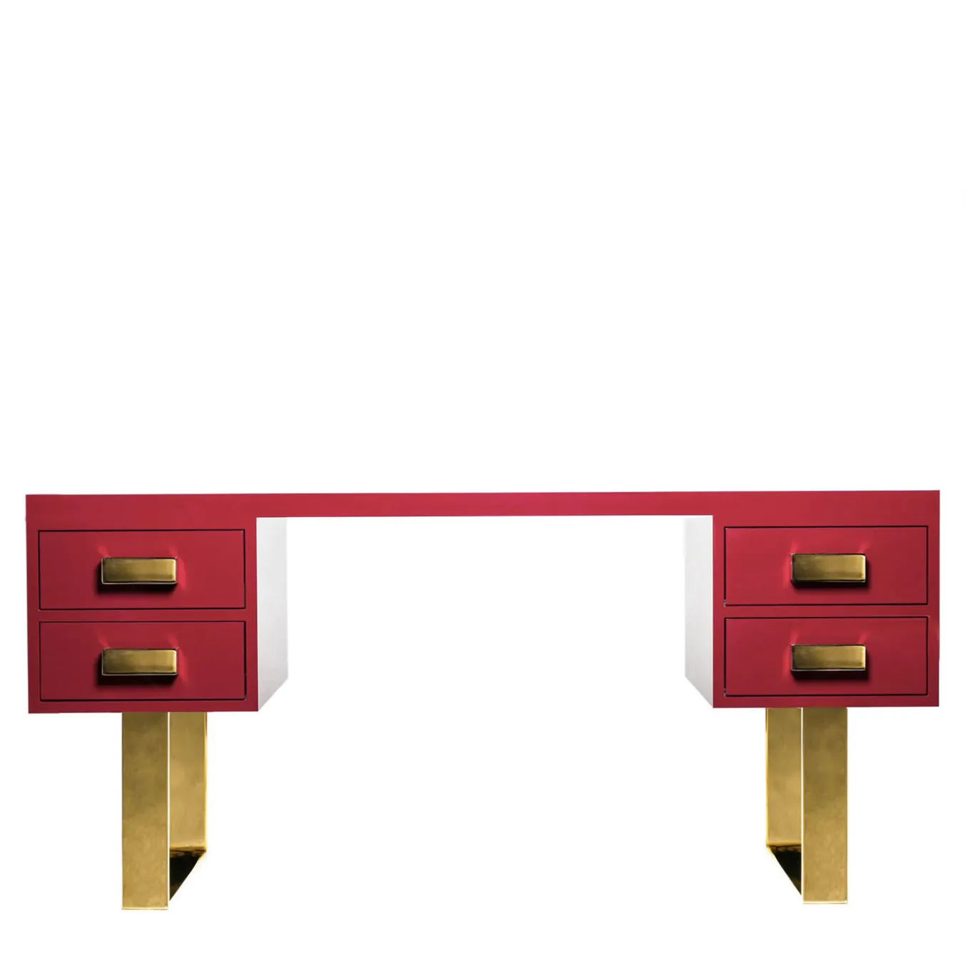 Borrowing inspiration from the silhouette of the mid-century modern desk, this piece is fashioned entirely of aluminum and features a rich coral finish with brass-colored detailing. The old-world aesthetic is captured in the squared frame with side cabinets, each with two drawers and bold rectangular handles. The sleek, U-shaped legs add a retro-modern look that will fit elegantly in any decor. This desk pays tribute to the Italian author Gabriele D’Annunzio and is inspired by his hillside estate on Lake Garda.