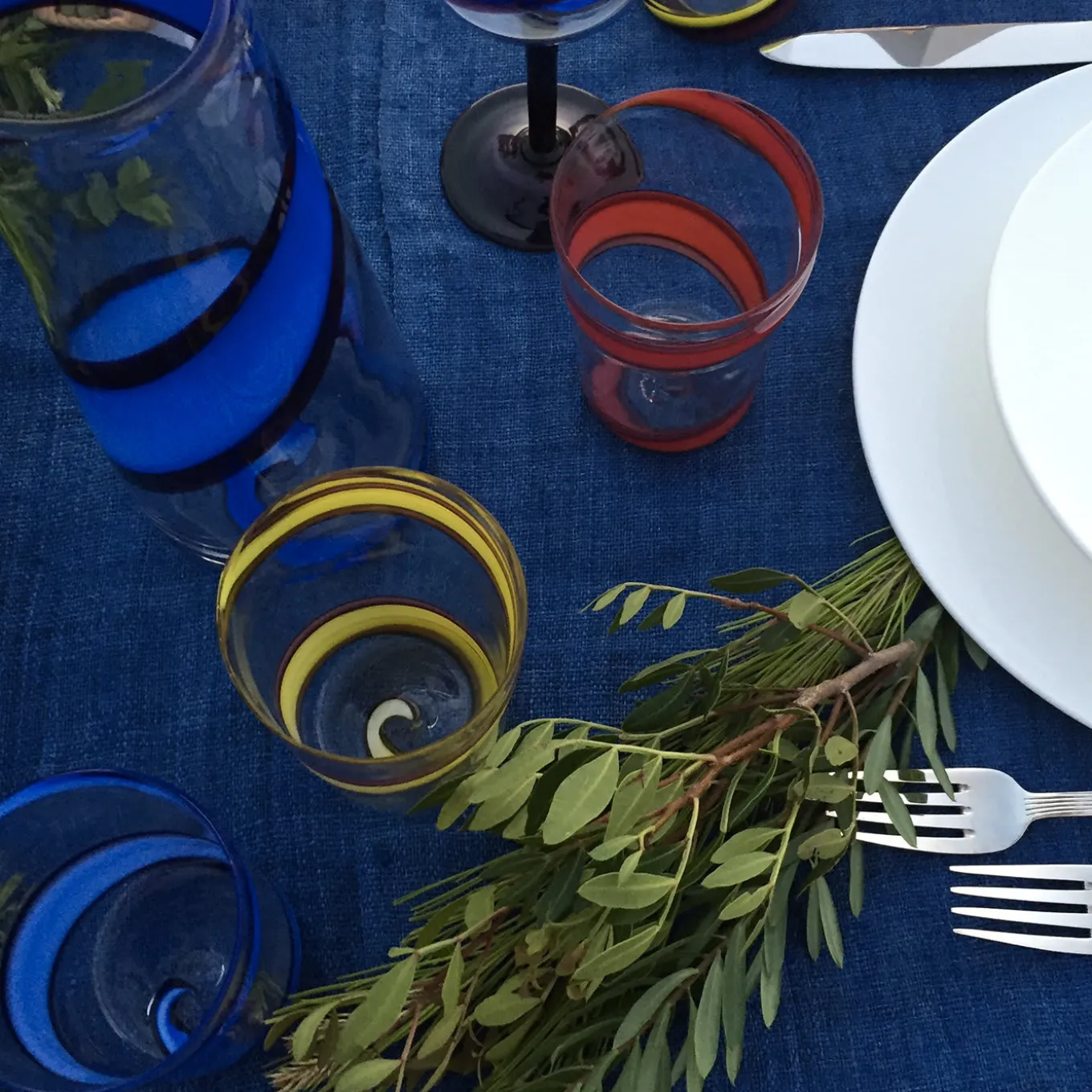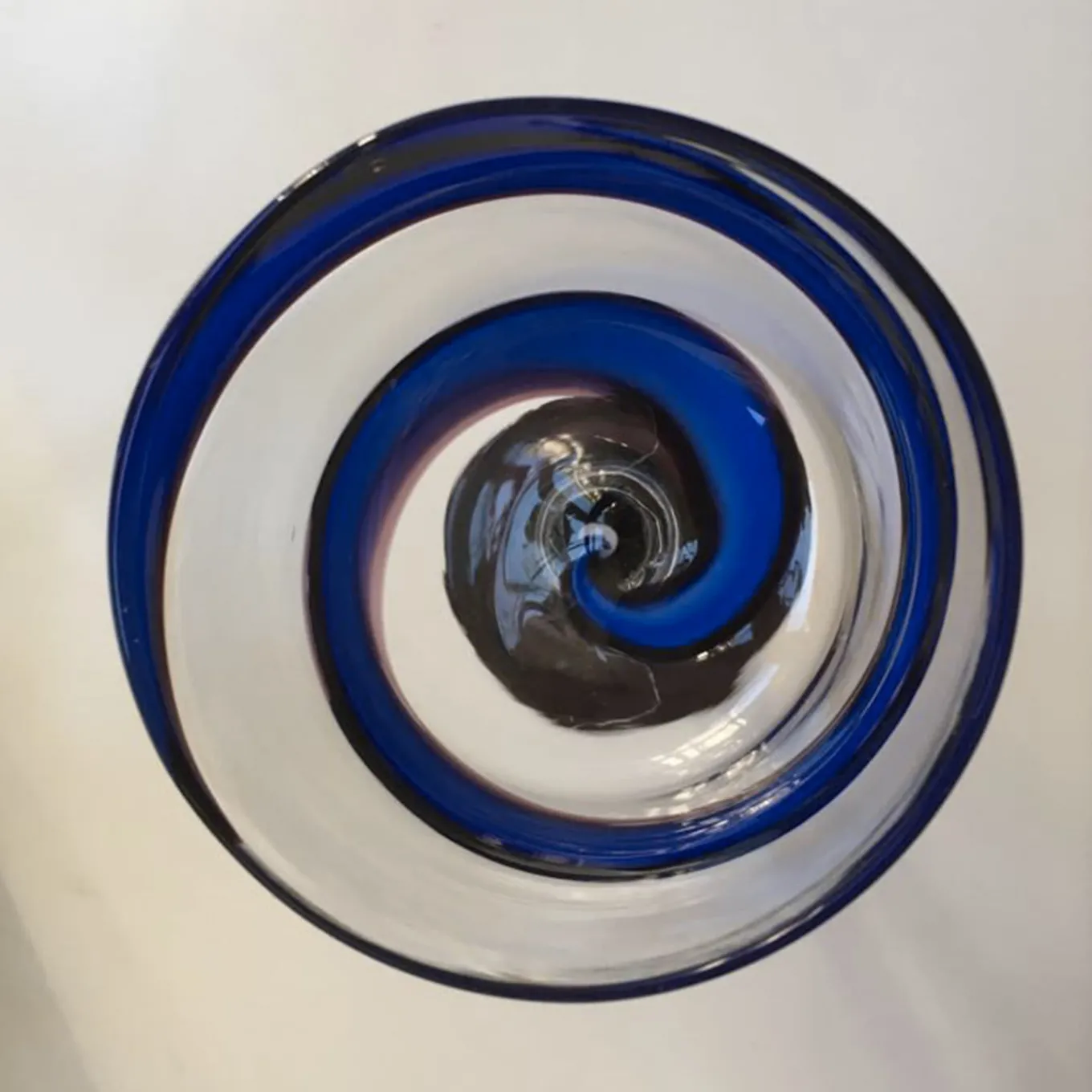 Part of the Vortex collection, distinctive for its striking decorative ribbon that curls around the surface of each piece, this stem glass of mouth-blown Murano glass can be combined with the other items in the same series and enliven both an elegant and an informal dinner, thanks to the unsurpassed luxury of exquisite craftsmanship. The round base measures 7.5 cm in diameter and opens up at the mouth with a diameter of 8 cm. The blue and purple colors are a superb addition to this sophisticated piece. Possible variations from piece to piece are due to handmade manufacturing.