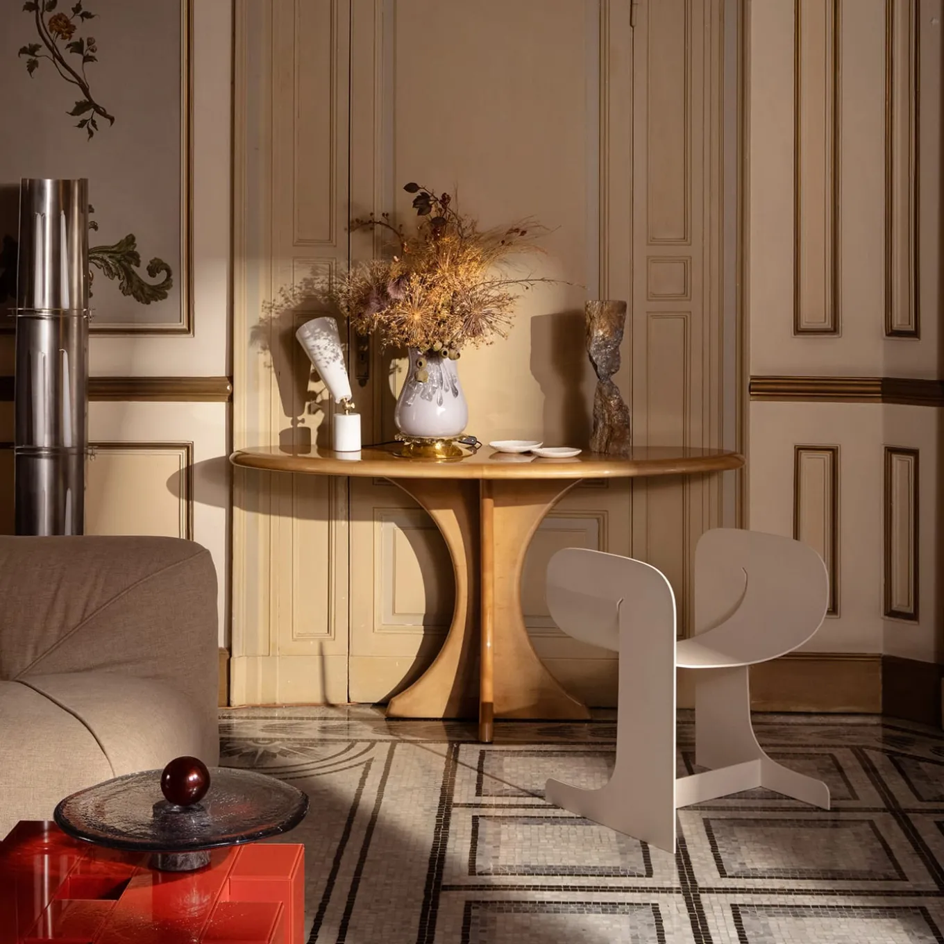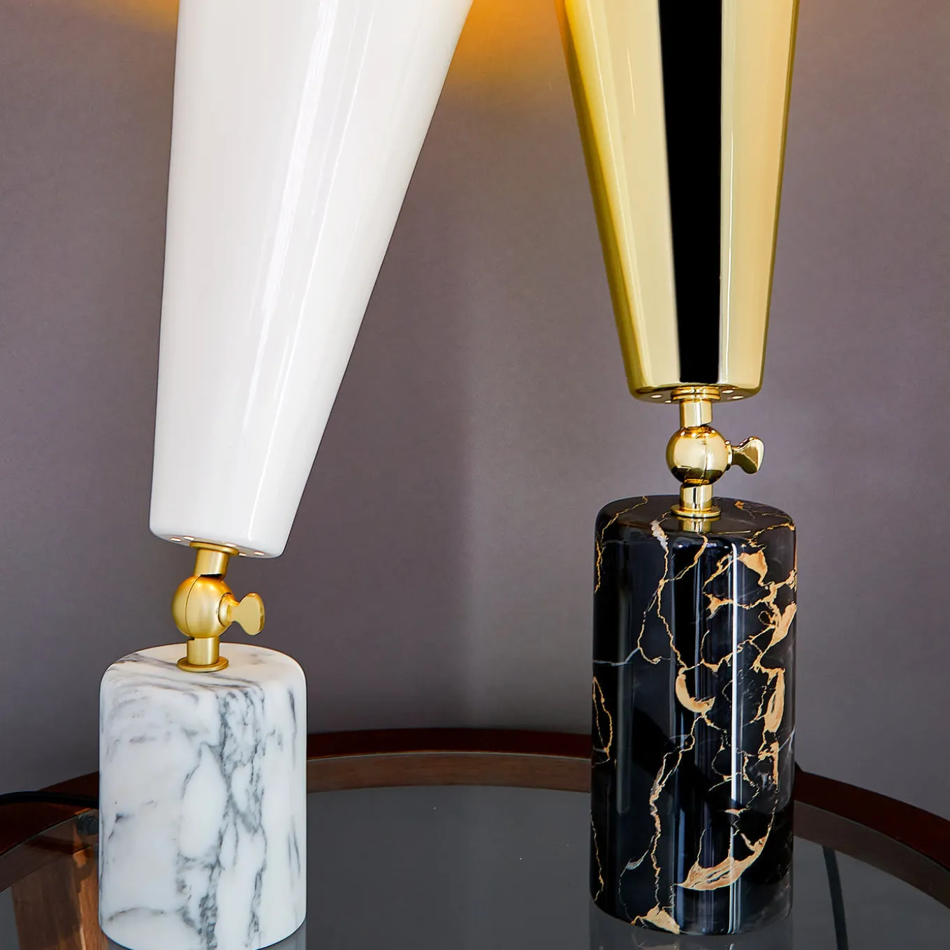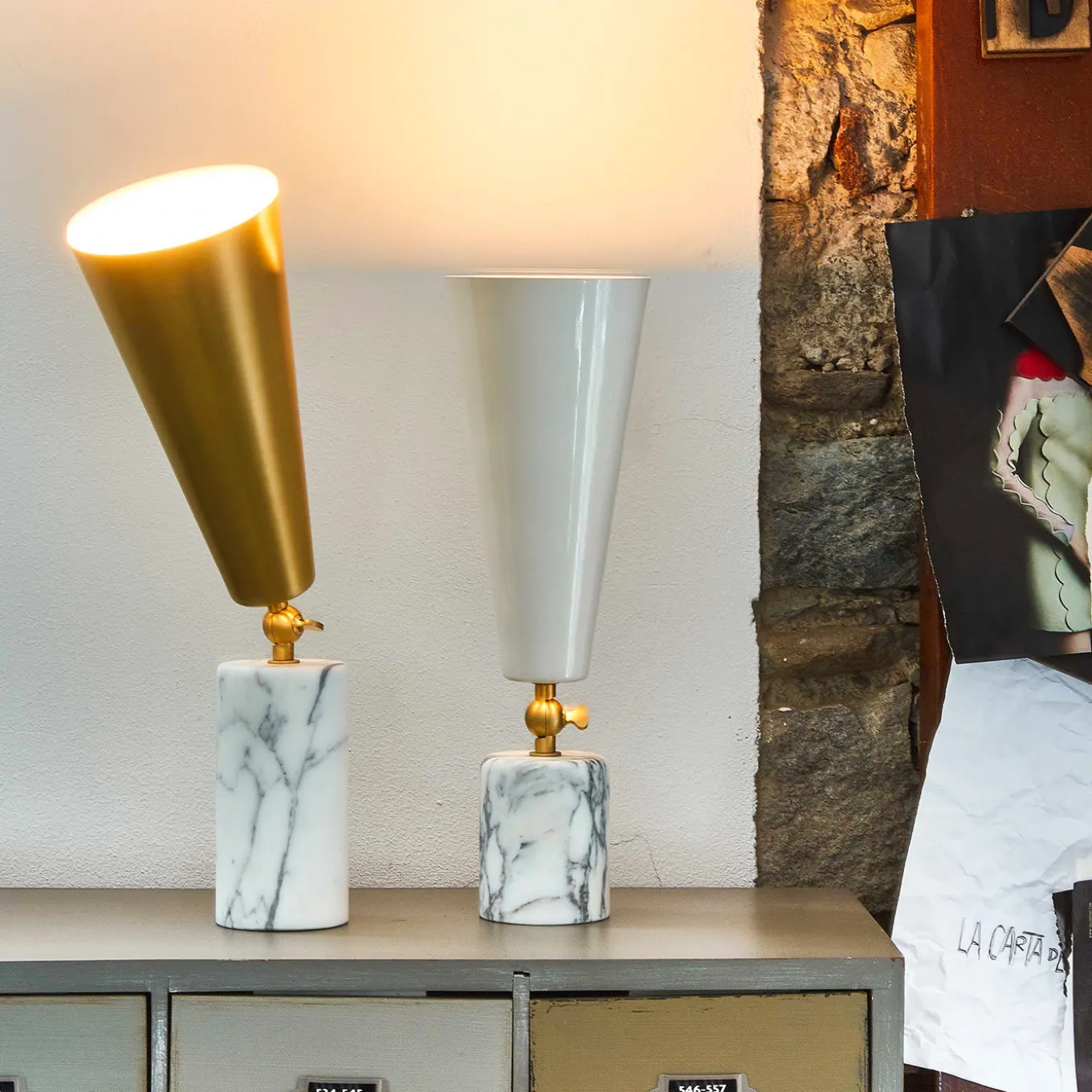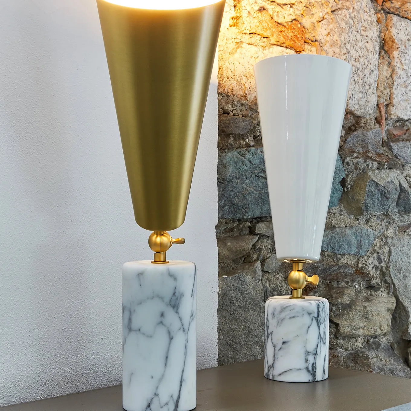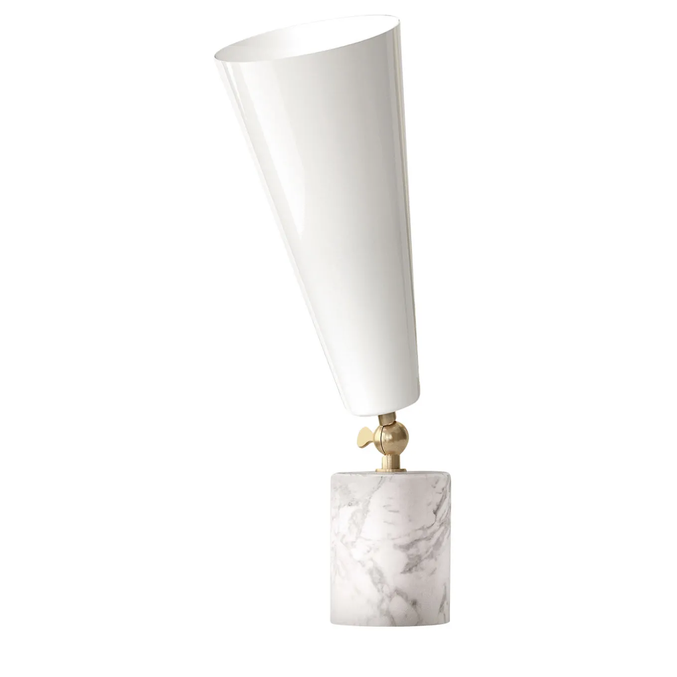 This striking table lamp features geometrical shapes complemented by precious materials. The cylindrical base is in Carrara marble and the joint that connects it to the white glass shade is in brass with a satin finish.