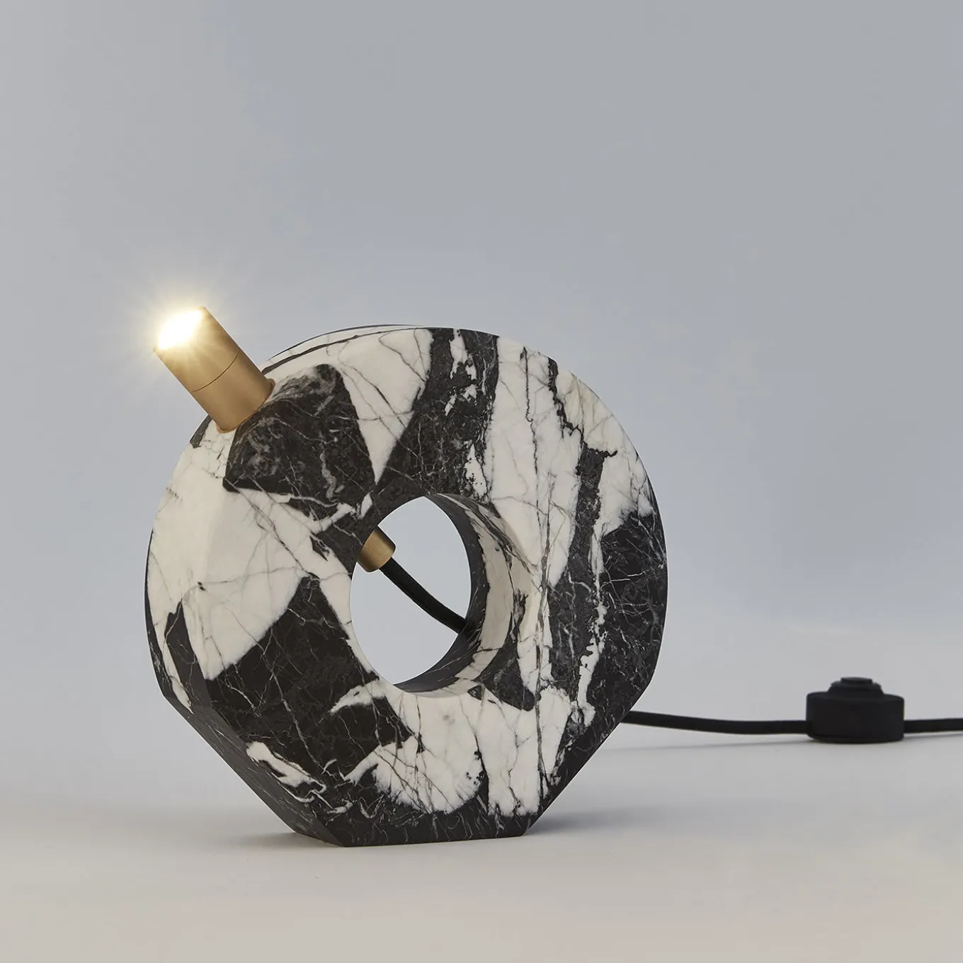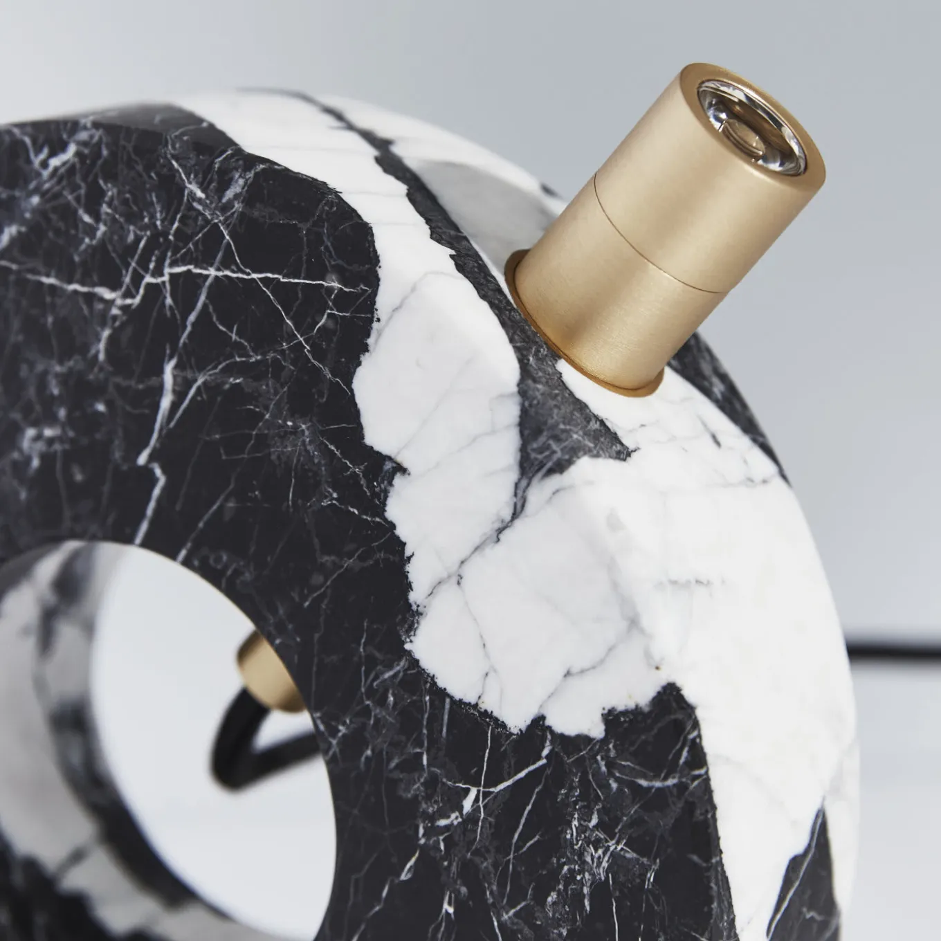 The sculptural allure of this table lamp is evident in the simple yet visually striking design defining its bold, disk-like silhouette in prized black-and-white marble. Providing illumination from a single, obliquely-oriented LED light encased in a golden metal tube, this design strikes with the seductive interplay of black and white veins that renders its distinctly contemporary flair. Grand Antique, Rosso Levanto, and Portoro marble variants are also available, please contact the Concierge for customization inquiries.