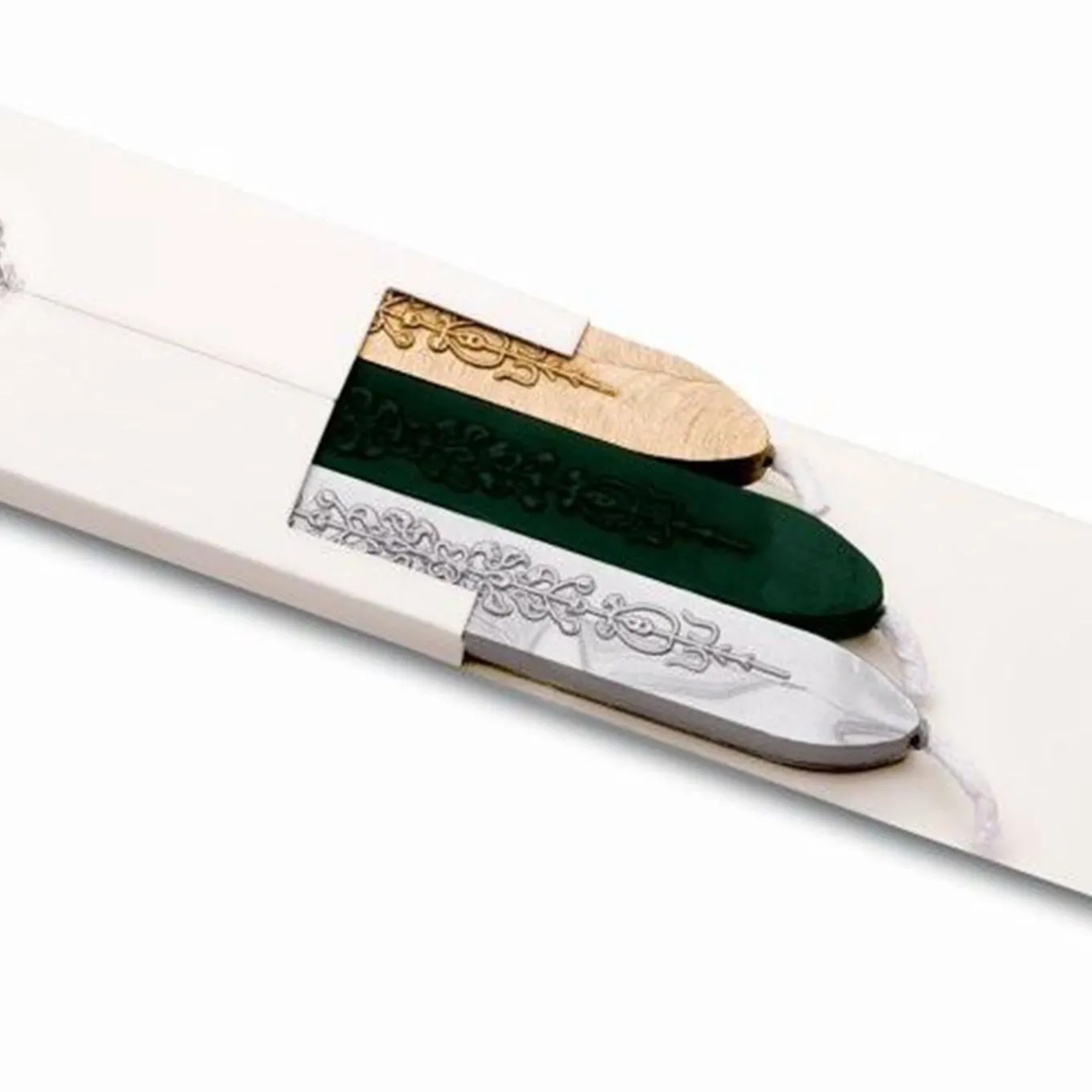 This lavish wax seal stamp kit is contained in a prized mahogany box featuring a black-lacquered cover with the engraved Pineider coat of arms. The kit comprises an aluminum stamp for the two red wax candles and three spare sealing wax sticks (Ø 2 cm) in green, gold, and silver. Special requests of monograms, logos or texts are available upon request, please ask the Concierge for details.