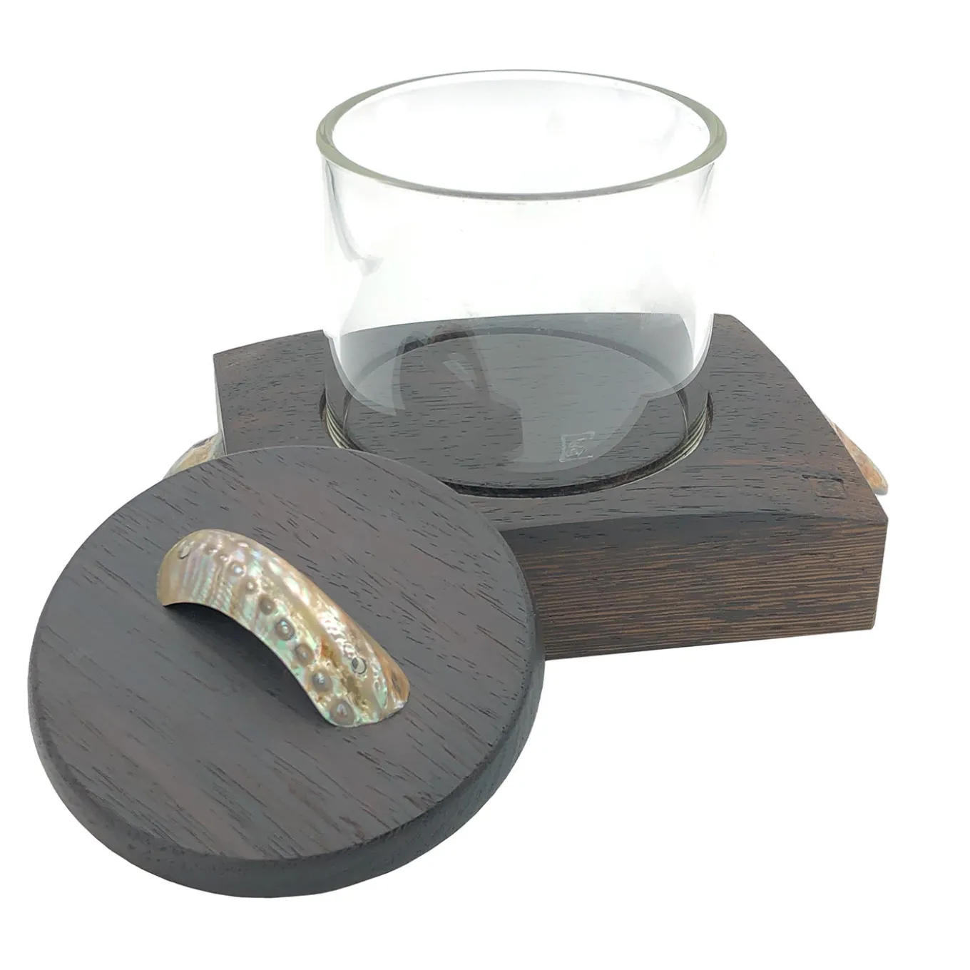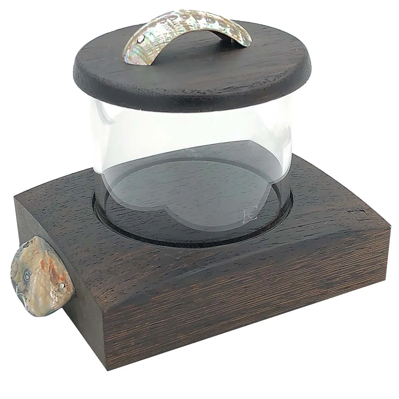 Set on an elegant and refined table, this truffle holder keep the truffle fresh and display the precious content at the same time. Merging natural materials in a simple silhouette, this piece is composed of a cylinder of borosilicate glass set gracefully on a rectangular base of dark-hued, smooth-textured wengè wood. The removable lid, also of wengè, and the sides of the base are embellished with handles of abalone shell, whose blues and green iridescence add a truly unique and glamorous allure.