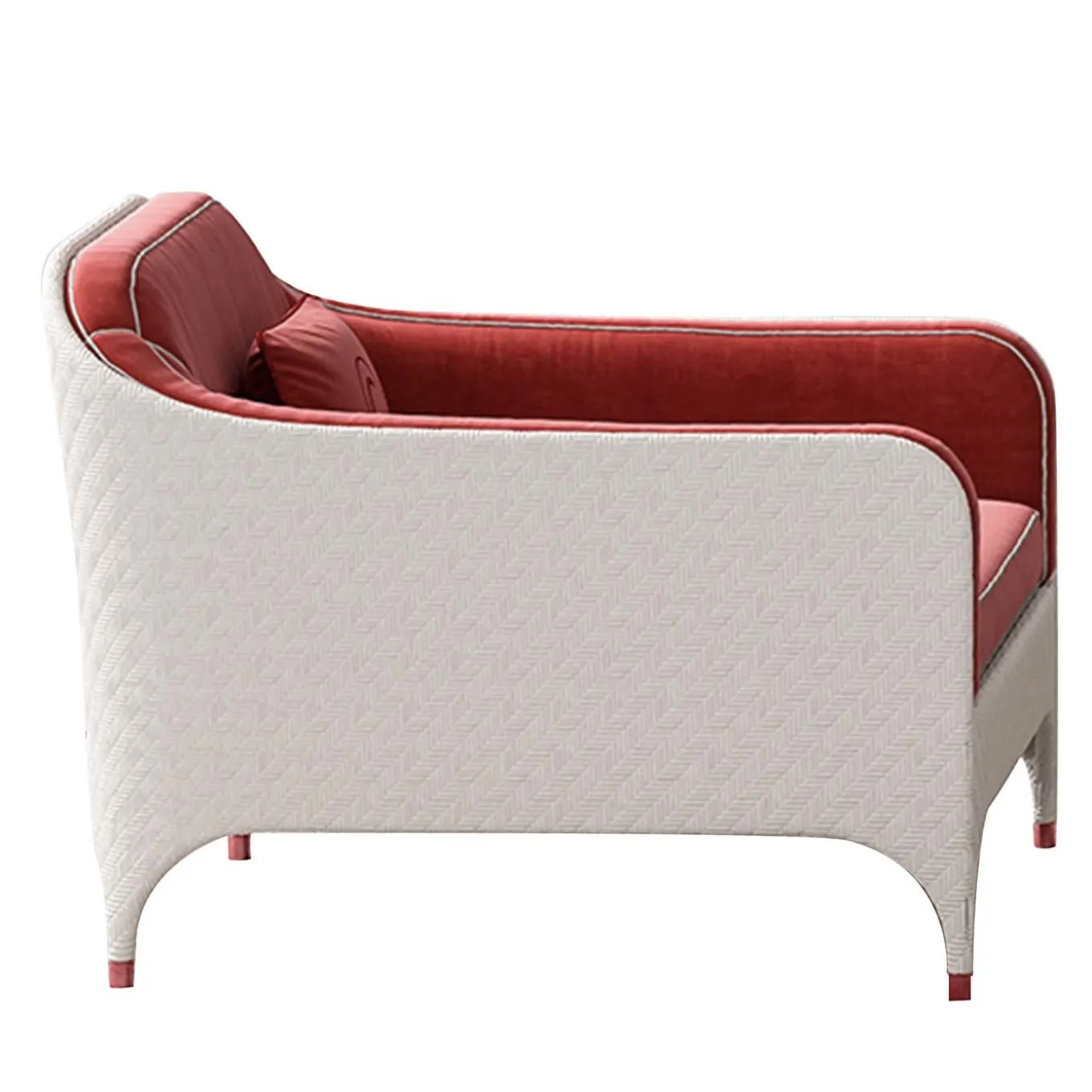 With its spacious and comfortable seating, this armchair creates the perfect lounge spot to relax outdoors by the poolside, on a terrace, patio, or garden. Finished with an elegant woven texture, the white resin-covered aluminum frame offers a luxurious seating experience, with its rounded and embracing back and armrests covered with perfectly shaped polyurethane-padded cushions of Tyvek-covered red fabric with white piping. Entirely weather and water resistant, the frame is also available in black, ivory, and red.