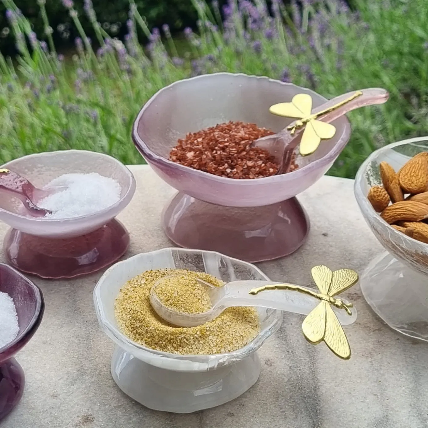 Flawlessly hand-sculpted in crystalline white Murano glass, this sophisticated set of two salt cellars will give an elegant touch to a modern or traditional dining table. Whether to present sauces, dips, condiments, or any dish enhancer, these two versatile pieces feature a rounded silhouette on a refined pedestal base, along with a matching spoon embellished by a captivating brass dragonfly. Measure 9cm in diameter.