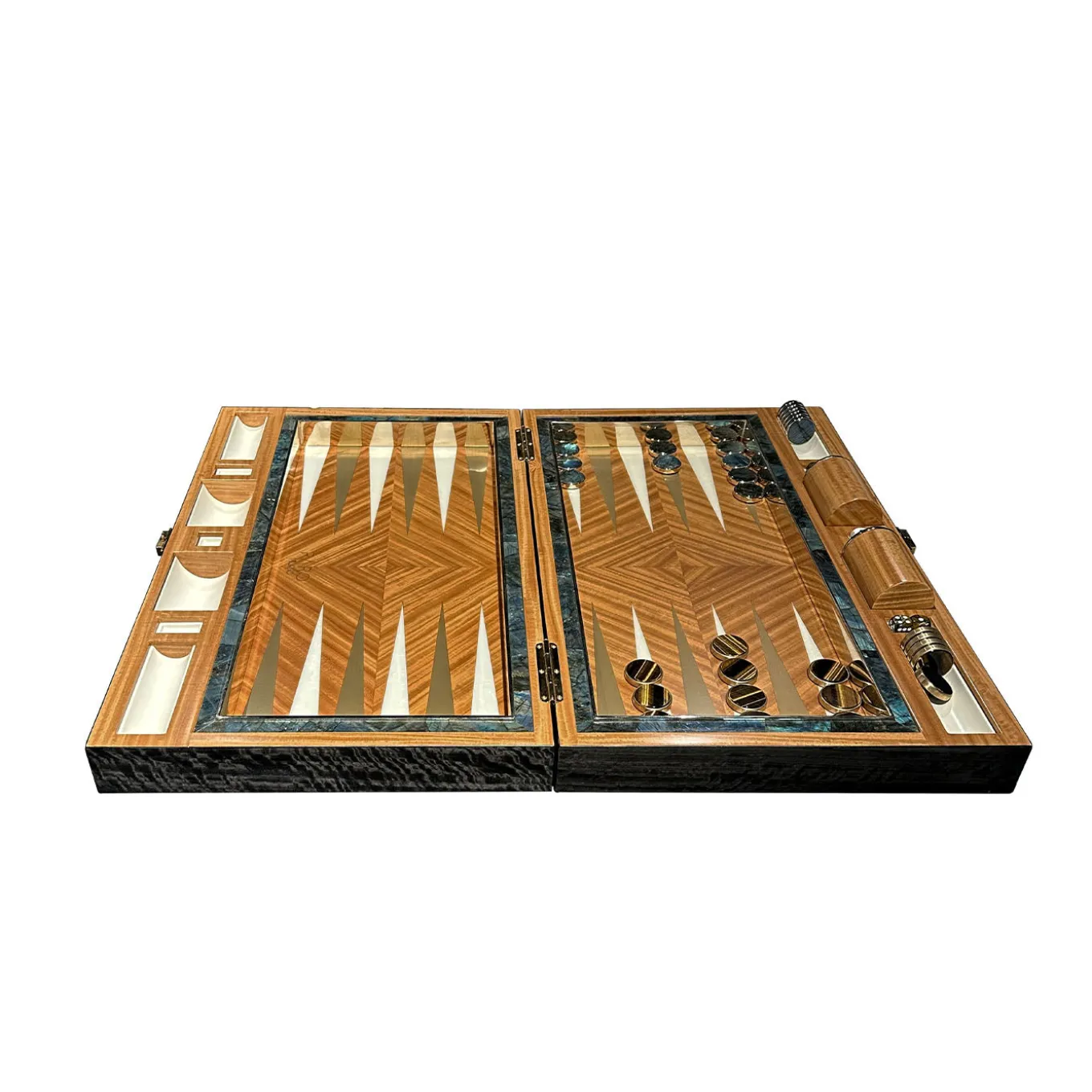 This piece, entirely handcrafted, features bespoke closures and hinges made exclusively for the brand, highlighting a commitment to exceptional detail and artisanal precision. The exterior showcases a sophisticated inlay of fine wood essences—including grey frisé eucalyptus, bleached maple, and citronnier—combined with brushed brass accents. The interior is enriched with luminous white mother-of-pearl and a hand-crafted mosaic border in iridescent labradorite. Game pieces include 15 satin gold tokens paired with tiger’s eye and 15 polished gold tokens paired with labradorite.
