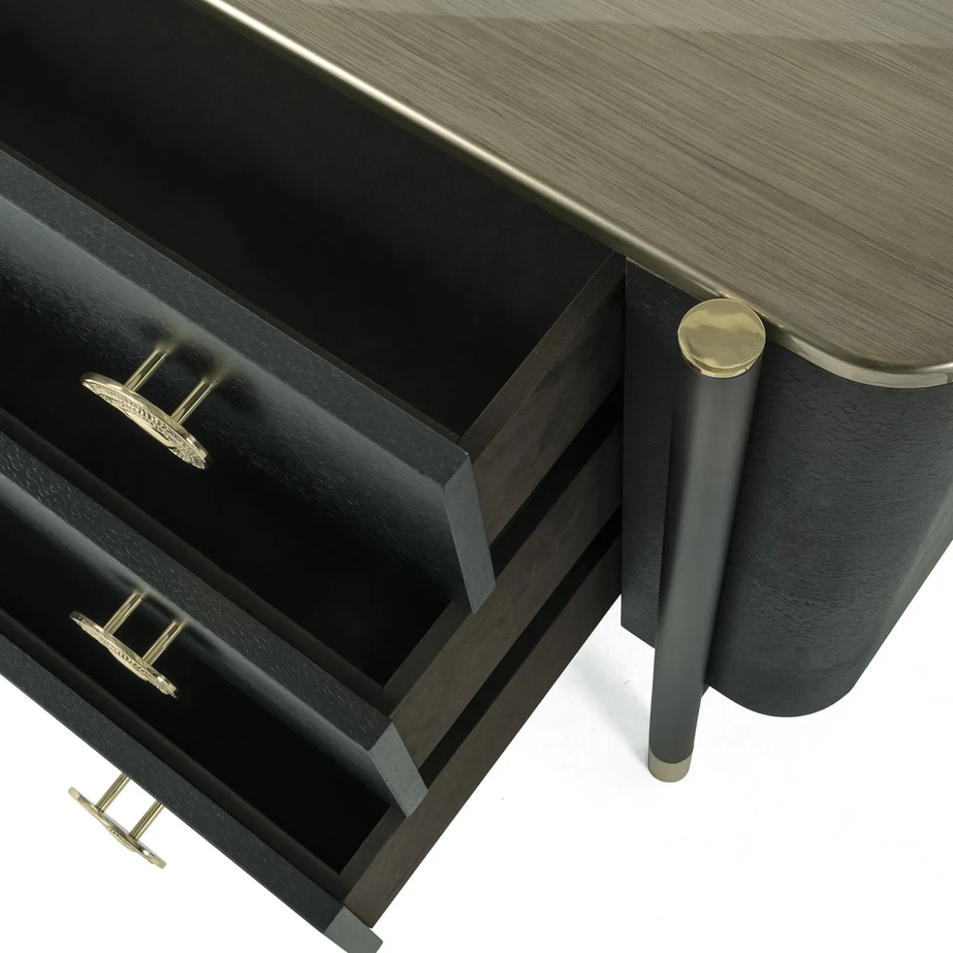 Designed to meet functional and aesthetic needs at the same time, the chest of drawers extends and integrates the Woodstock line. The refined structure with clean and elegant lines is realized in dark wengé dyed wood with tips in polished brass, reflecting the style of the other furnishings of the collection, while the iconic Paisley symbol that lends its emblematic shape to the handle becomes a decorative element full of suggestions and meanings.