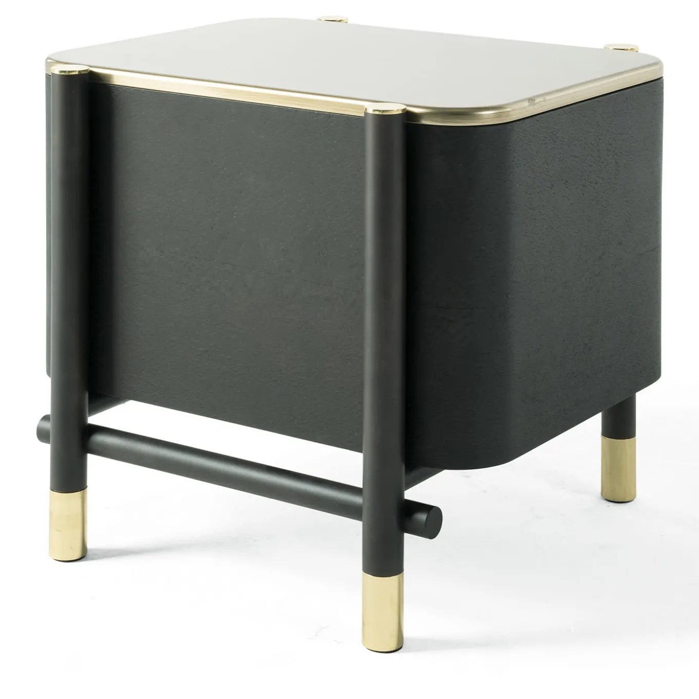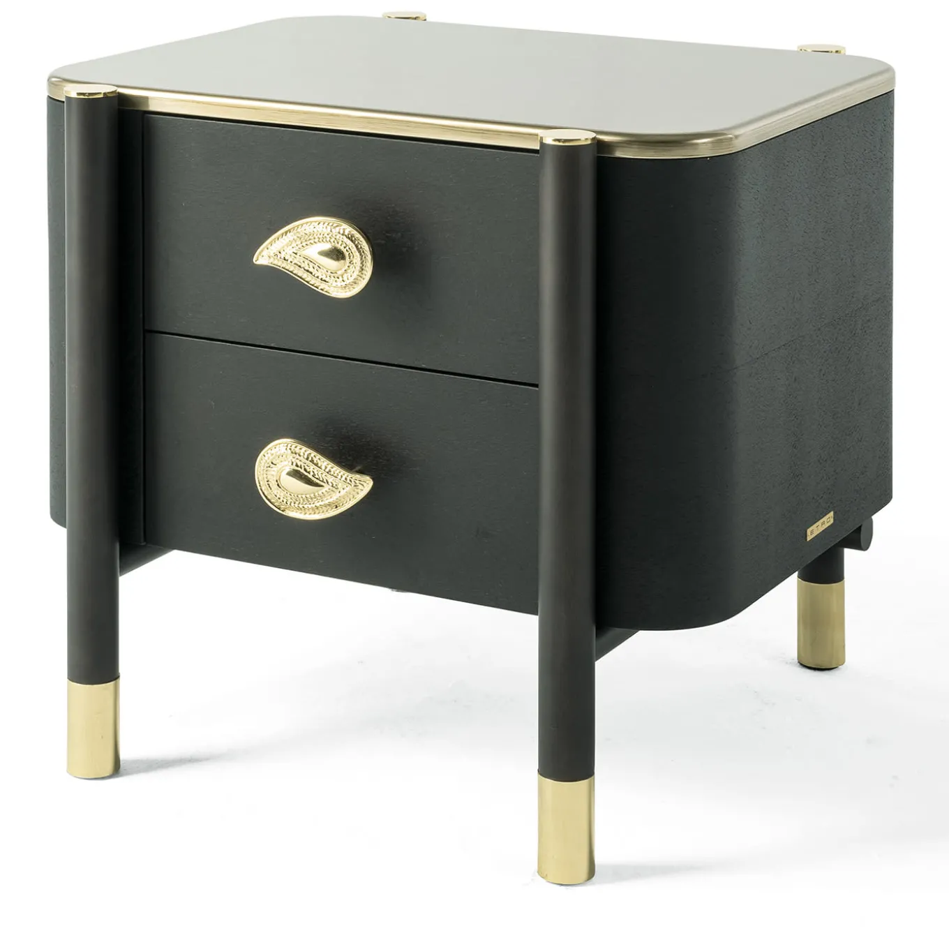 Characterized by a sophisticated dialogue between different materials, the night table of the Woodstock line is designed to meet functional and aesthetic needs. The structure in dark wengé dyed wood with tips in polished brass reflects the style of the other furnishings of the line, while the iconic Paisley symbol that lends its emblematic shape to the handle becomes a decorative element full of suggestions and meanings. Woodstock Structure in matt Dark Wengé dyed wood, with polished brass tips.