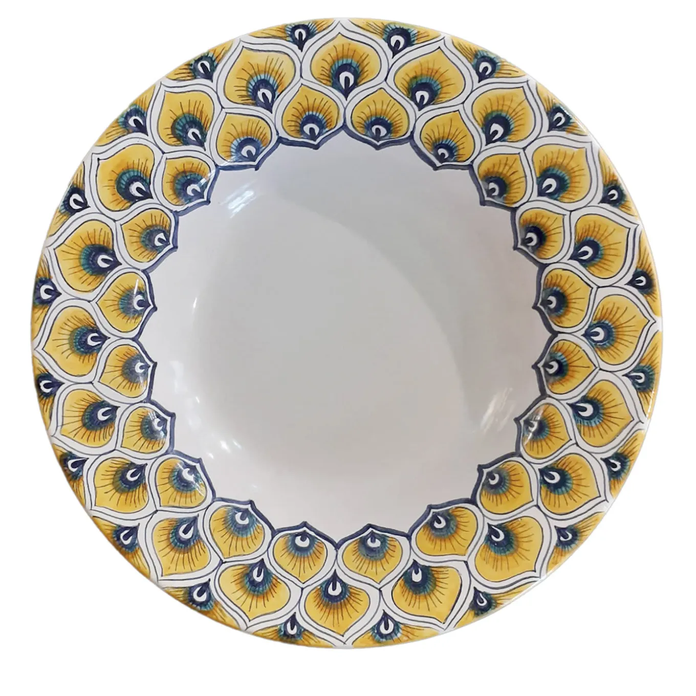 This one-off plate fashioned of prized white majolica boasts a delightful decoration of hand-painted peacock feathers in yellow and blue tones splendidly accenting the rim. Sure to imbue any table setting with its vibrant personality especially when displayed with twins, this round soup plate is entirely one-of-a-kind thanks to the unrivaled artistry of master ceramist Maria Rita Nicolini who designed the Yellow Peacock Feather Collection.