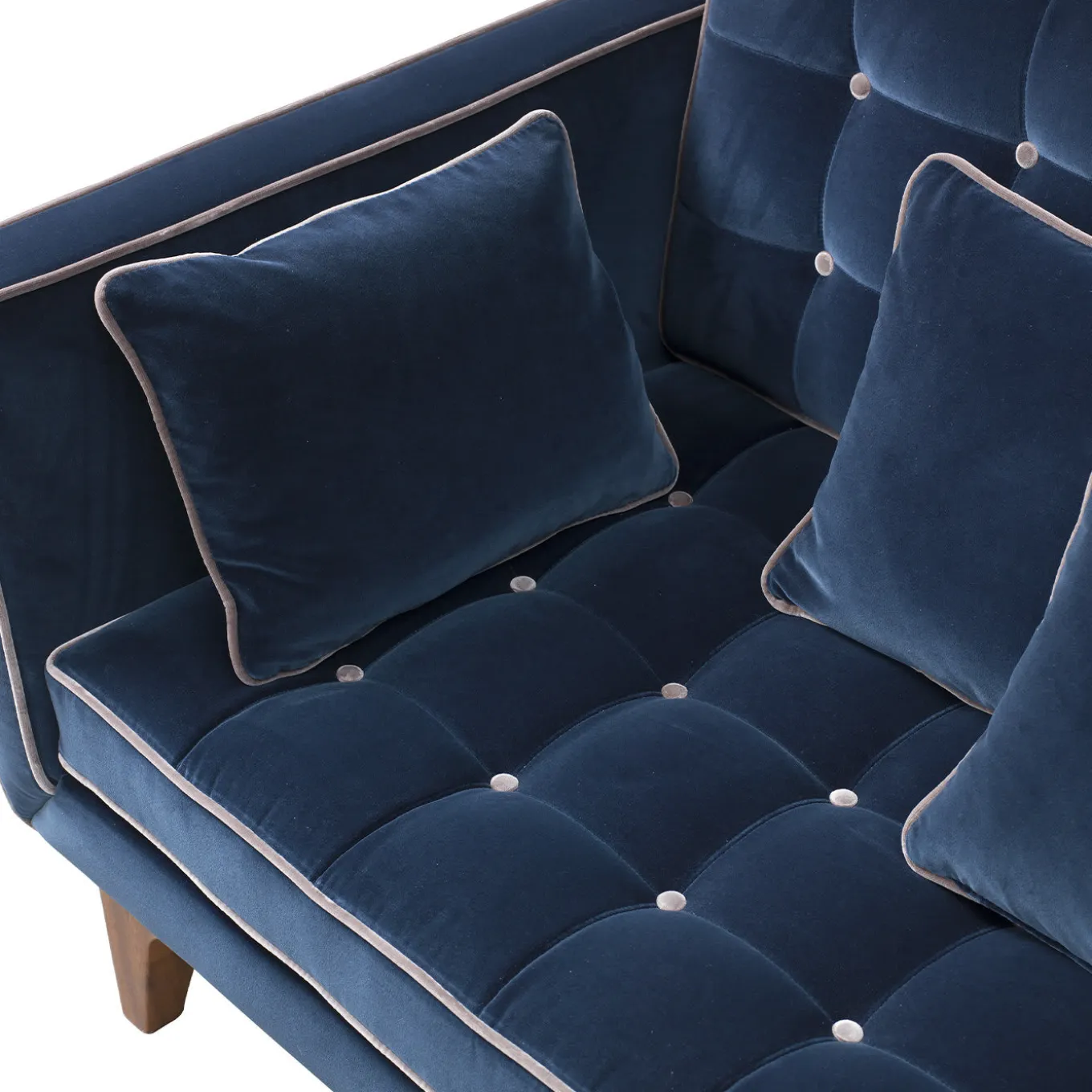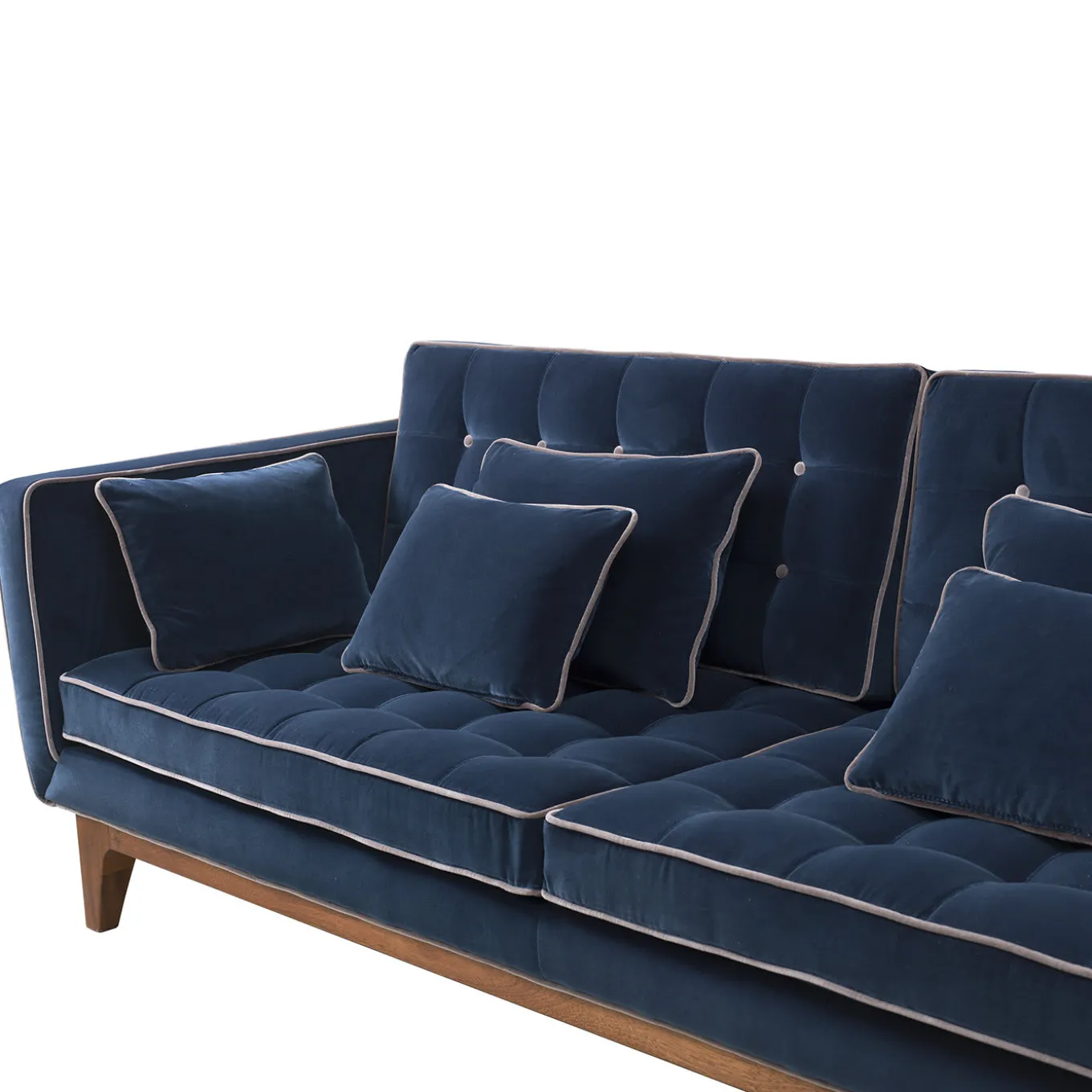 If you’re looking to create a modern feel with traditional undertones, look no further than the Yvan Sofa. Supported by a solid mahogany base that channels mid-century influences, its deep blue velvet upholstery is accented with contrast trims and classic button-tufted quilting. A seamless fusion of comfort, style and versatility.