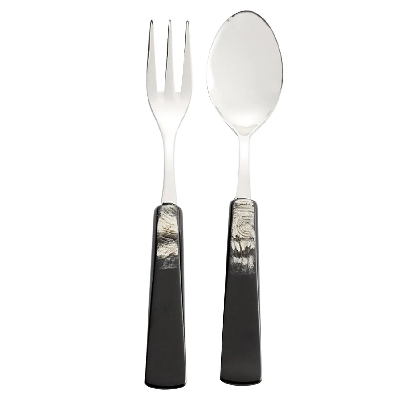 Clean, contemporary lines of bright and luxe flair capture the utterly refined essence of this serving cutlery set, comprised of fork and spoon suitable to serve any type of dish. Fashioned of stainless steel finished in a mirrored and polished hue, each piece is enriched with a stunning handle, handcrafted of bio-based sustainable resin distinguished by mesmerizing earthy and sandy hues. This set includes a velvet case.