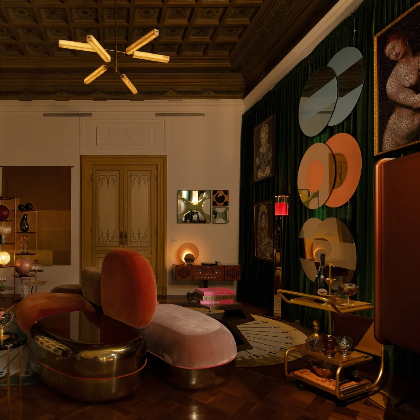 This superb bar cart was conceived with opulence and functionality in mind. Finished in shimmering gold leaf for a striking statement of luxury, its sinuous tubular steel frame is equipped with three trays – one of them removable – where to collect liquors and tumbler sets for sophisticated after-dinner moments. A practical pocket and the trays’ bottoms are in prized restored leather. The pivot wheels complete the design.