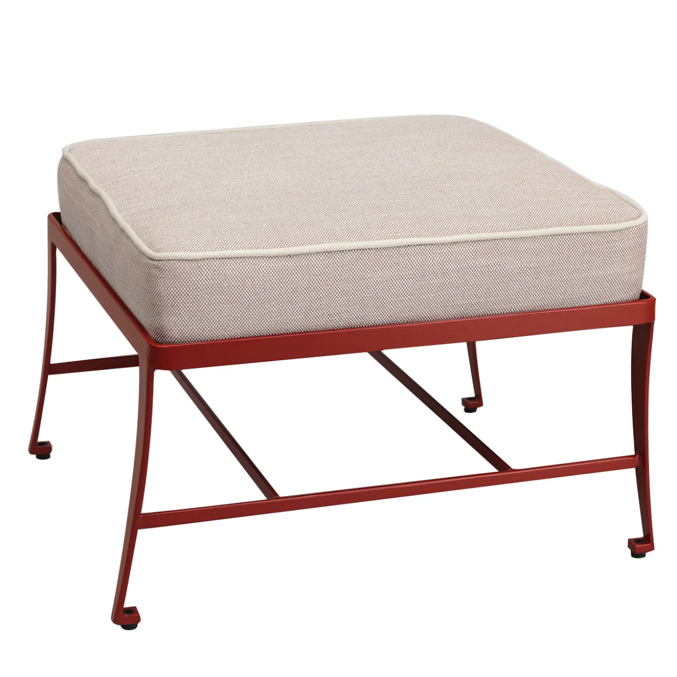 This elegant galvanized, powder-coated, wrought-stainless steel pouf features a red fabric cushion that is suitable for outdoor use. It decorative rod base creates a handy storage shelf. This piece represents a union between traditional Florentine craftsmanship and the quest for high-end contemporary design.